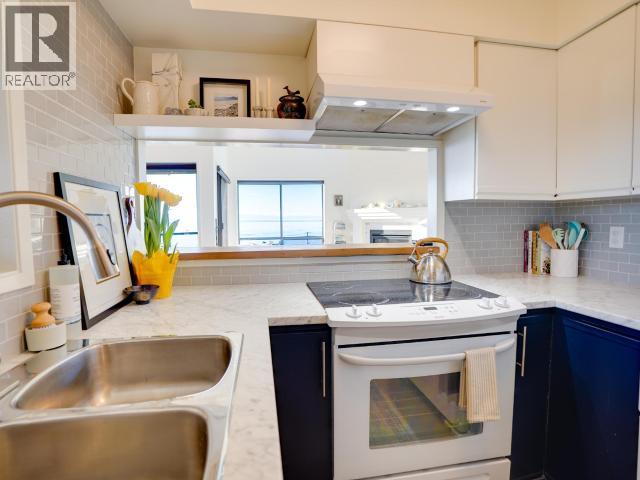 Perched in the top corner of a well-maintained building in a central residential neighbourhood, this 3rd-floor condo offers a rare sense of calm, light, and elevation. The interior is thoughtfully designed to feel as though you're living in the clouds. Finished in soft whites, the space enhances natural light while keeping the sweeping horizons as the focal point throughout. Vaulted ceilings frame awe-inspiring ocean views and unforgettable sunsets that colour-drench the rooms -- an atmosphere that photos simply cannot capture and must be experienced in person. The main living area opens to a wrap-around balcony from two rooms, complemented by a private balcony off the bedroom. Multiple vantage points allow you to enjoy the views throughout, including from the updated bathroom. Immaculately kept with a refined aesthetic, this home feels both comfortable and luxurious, with quiet neighbours and a peaceful setting. (id:25560)